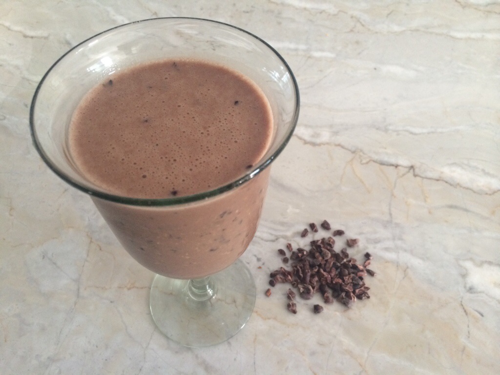 My two favorite ingredients blended together are cacao powder, cacao nibs and almond milk. Just put these ingredients in a blender and you will have this decadent smoothie in a matter of seconds.